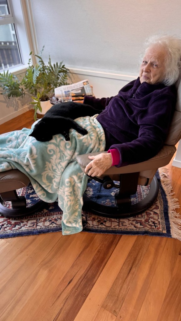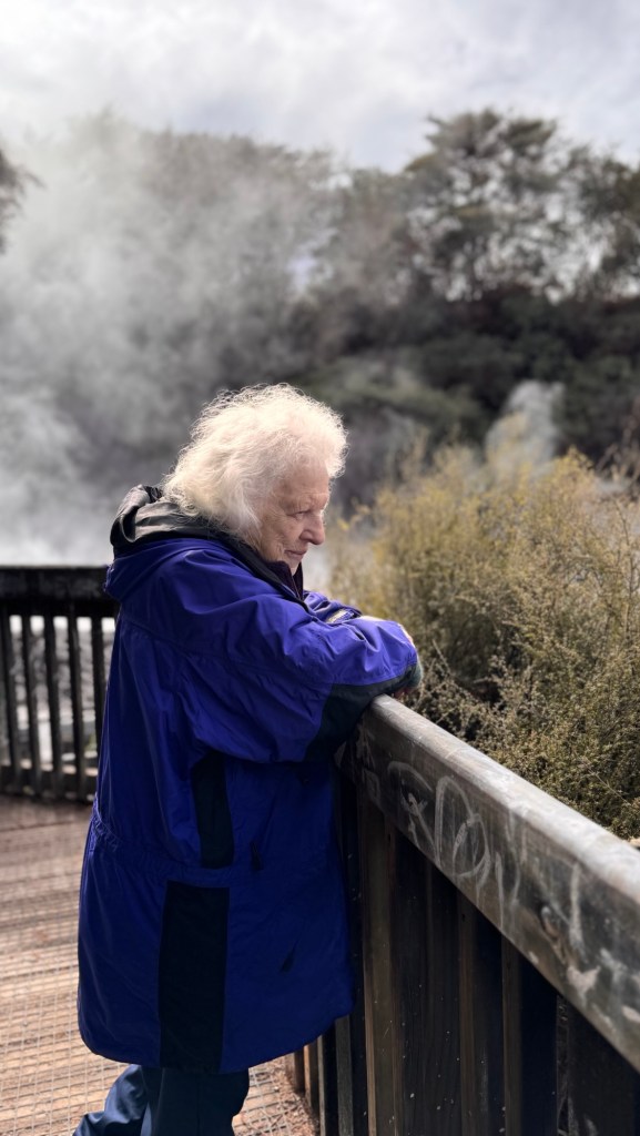 We thought we would experiment with having mum come up and visit me instead of me going to Christchurch. The concern with her dementia was if she could cope with being in a strange place with no cues that she recognised. Apparently this can trigger increased confusion, so the task was to try and minimise the opportunities for this and try and give her some new experiences. I started with making sure anything I had of hers was out and visible and I made a big notice in her bedroom to say she is at my house and she is on holiday. Ian (brother) flew up with her and she coped very well with the flight. Once here she just loved being around us and someone feeding her chocolate and nice meals. She contentedly took my chair looking out at the view and loved every minute of her holiday. My friend Lee introduced her to her chickens and we visited bubbling mud, small excursions but enough. Just 4 days but we noticed she was becoming more lucid and remembering things that had just happened. Having Ian here meant I could get groceries and manage normally but if he wasn’t here it would become overwhelming very quickly to not be able to leave her alone for a moment. Back in christchurch she knows her home well and I can escape for an hour or two but here it’s a different story. I think I could manage about 10 days so the plan is for me to go back to chch in October and then bring her back with me for maybe a week. She just loved the company more than anything and she always tells me she feels better each time I come down and stay with her. I wish there was a magic solution but it is so full on 10 days every 6 weeks is almost as much as I can handle. At 91 she is healthy and mobile (short distances) pretty good really.