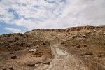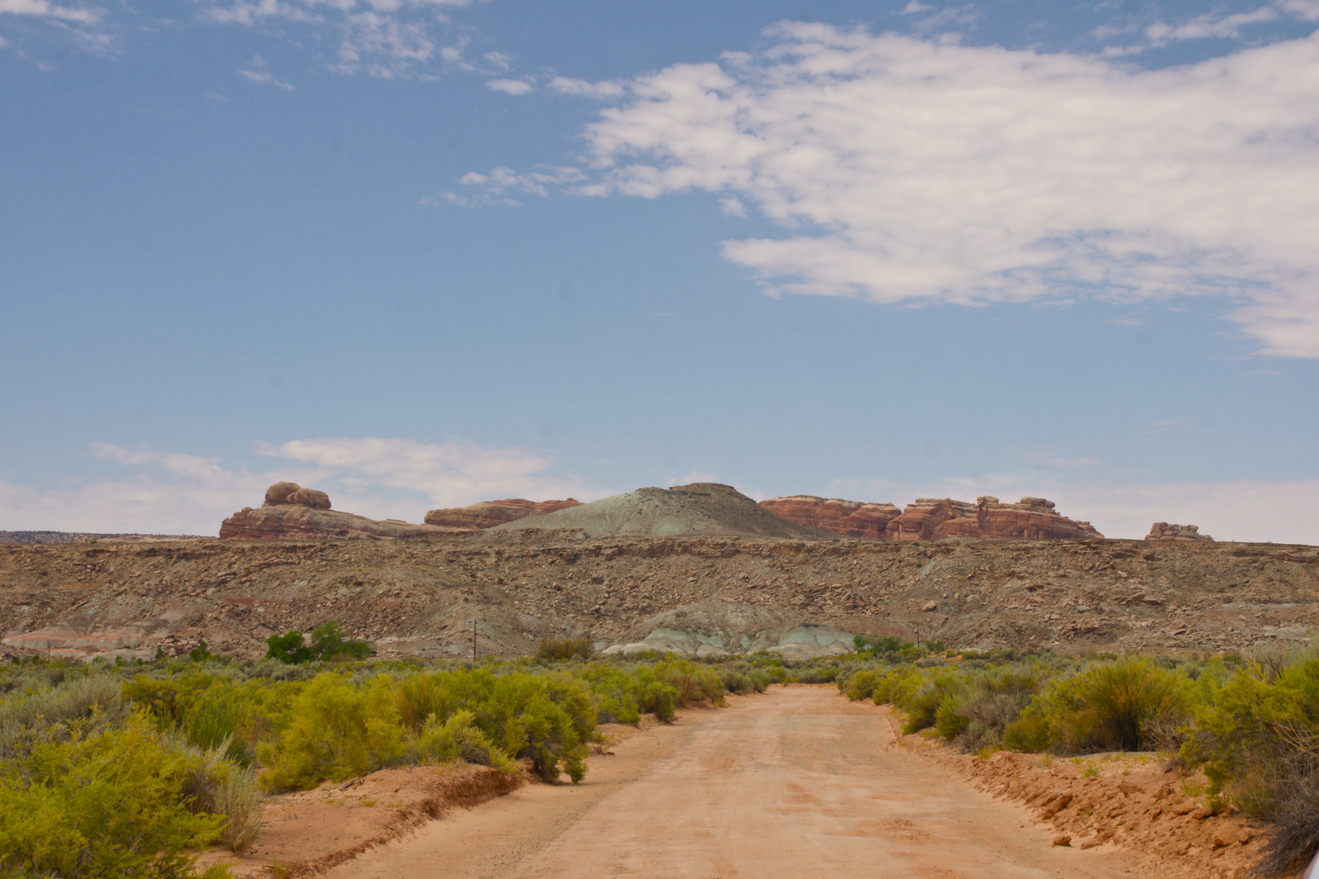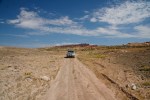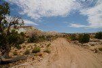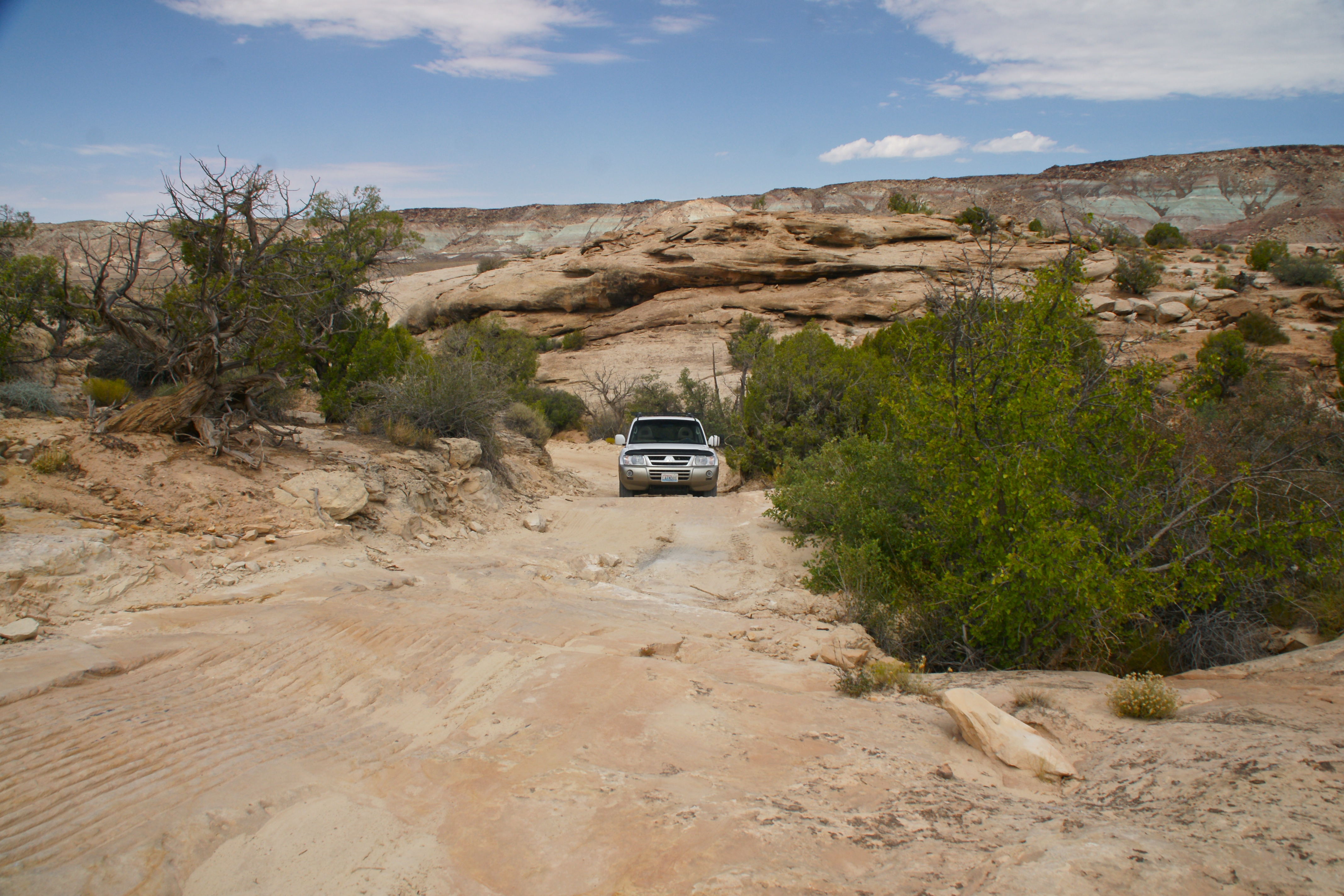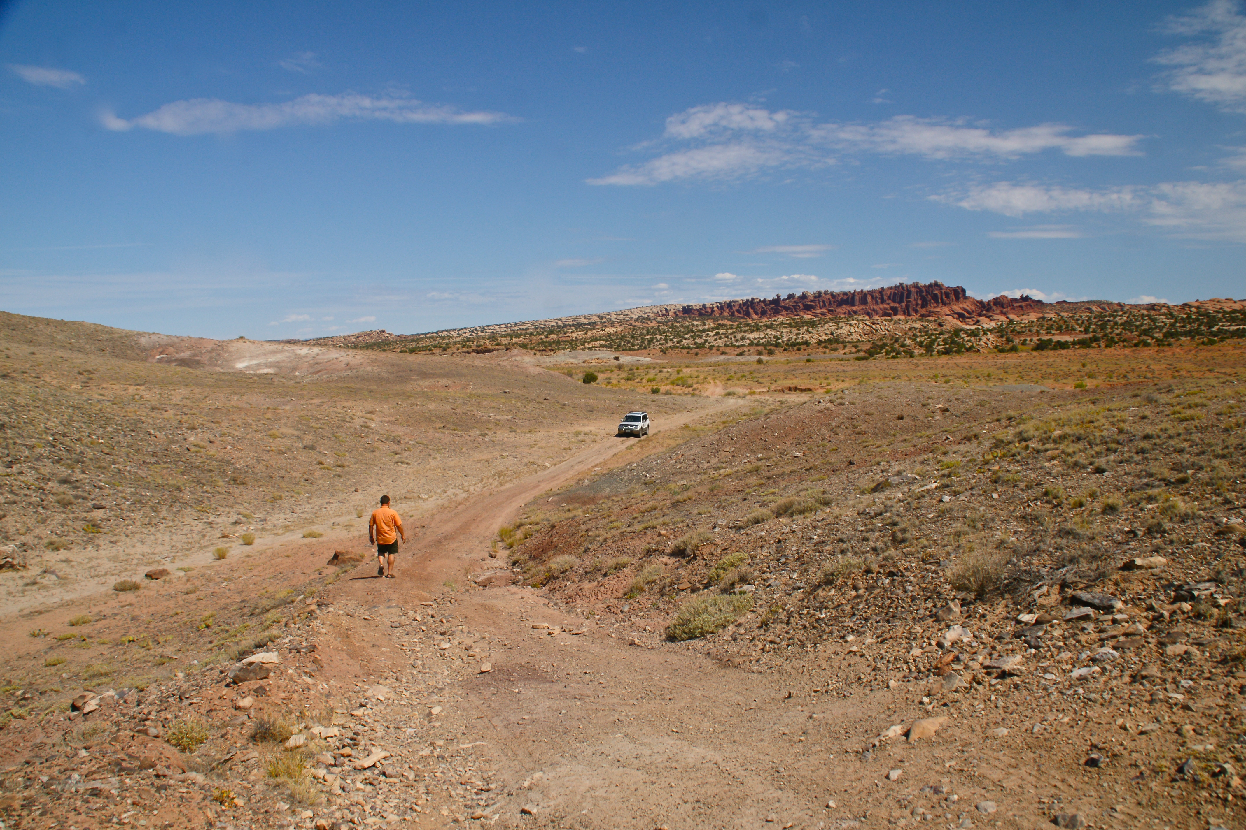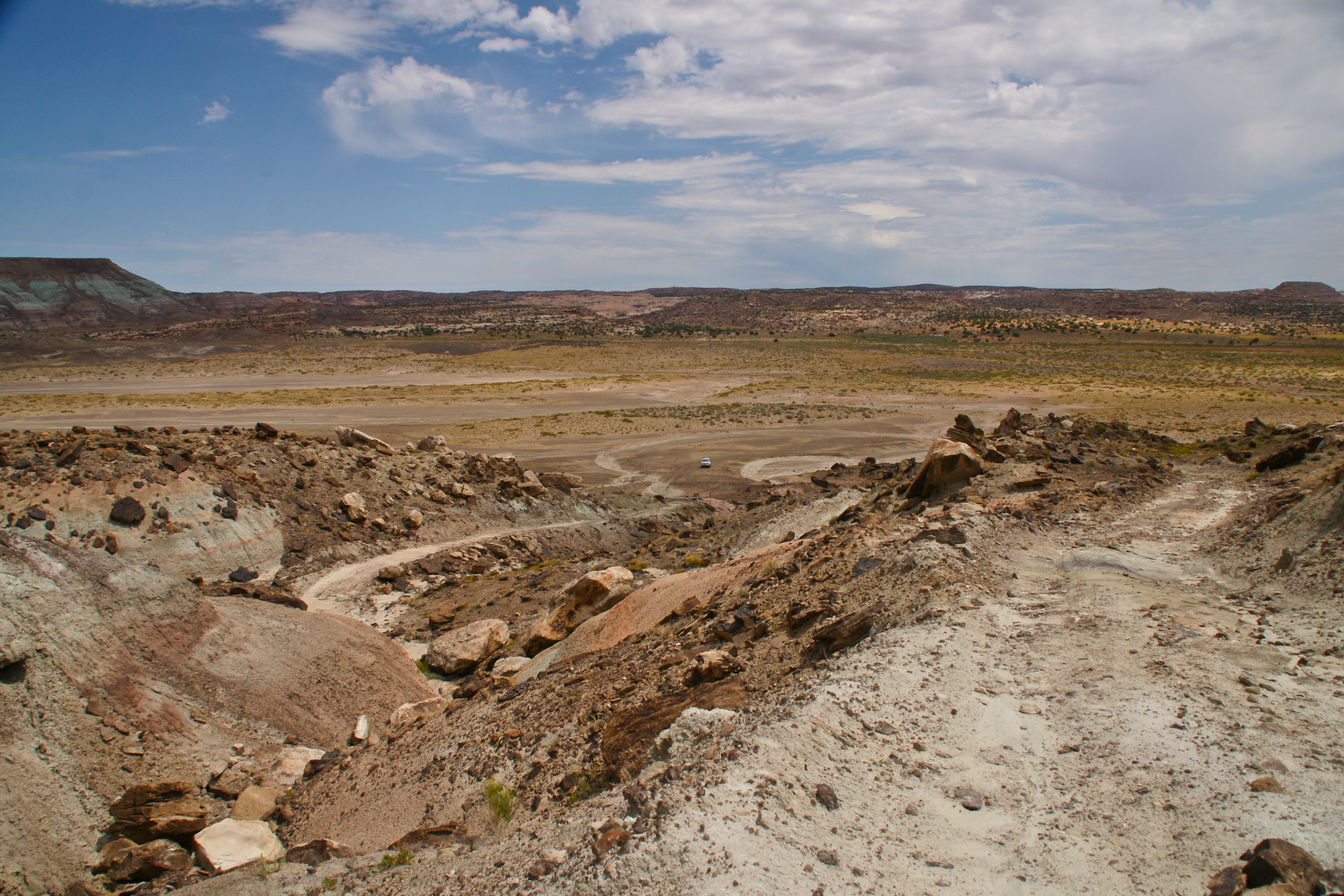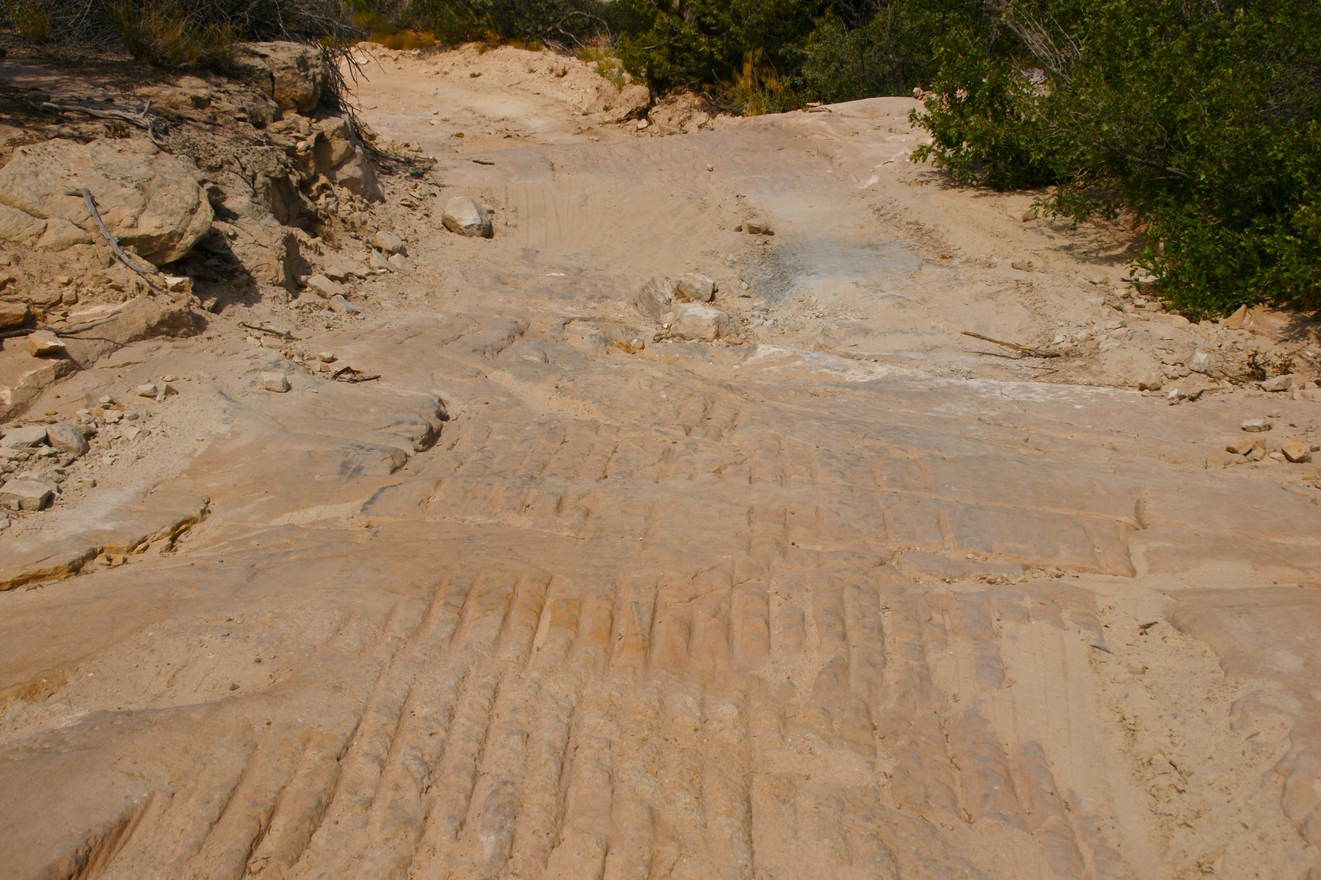 Long story and lots of photos today. We set out from Grand Junction nice and early planning to look for dinosaur bones at a live dig that Ori had given us directions to. It was off the beaten track and we knew we would be away from main roads but we didn’t know how far off and what we were in for. We found the Japanese Internment Camp road and followed the track from the foundations of the old buildings. Not knowing that the rainstorms had washed away the track we were looking for we kept going until we found the first left in the dusty gravel road. The road quickly became a four wheel drive obstacle course with steep uphill climbs on sheer rock with parallel gouges in the rock for grip. I decided to get out and document the progress and scout ahead just in case there was nowhere to turn around. We drove for miles in open desert following a path meant for bikes. We eventually came to an area we really couldn’t go any further. The temperature outside was getting up past 107F and we didn’t have alot of water left. So we convinced Joe ( who was happy to slog on even though it was obvious we were lost and he had two passengers too scared to stay in the car)  On the way back out we decided to take a detour over a river wash that had no tracks on it and found ourselves 3 hours later at the place we had been searching for at the beginning.  We headed up the steep mountain track by foot. The path was cut in two from the runoff and no vehicle could have made it -not even a bike. We got about 1/2 way up and the heat was too much. Back in the car we decided that we would explore this area when it gets cooler, like mid winter. The scenery was amazing, each direction you looked there was a completely different landscape. On one side mountains the distinct turquoise blue of the Morrison layer ( where the dino bones reside)  Ahead the back of arches national park with its distinct red monoliths, to the right rocky outcrops and tortured trees, behind us stoney desert. Definitely a place to explore, but with lots of water and food and a four wheel drive built for the desert. Monty served us well but we were stretching its capabilities.