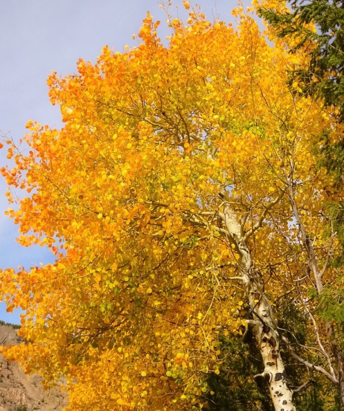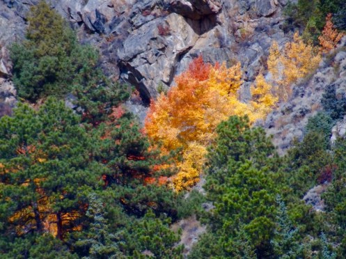 We drove up the Poudre River looking for the changing aspens. We were a little late but there were still pockets of color that looked like fire glowing against the dark green pines.