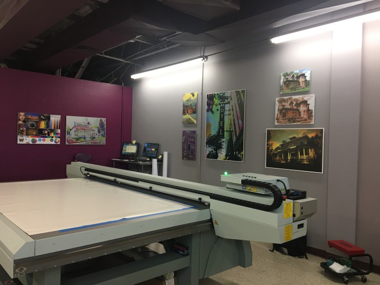 Printer and photos on the wall printed on all kinds of media