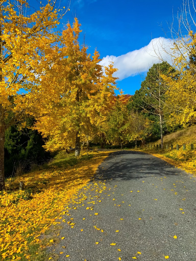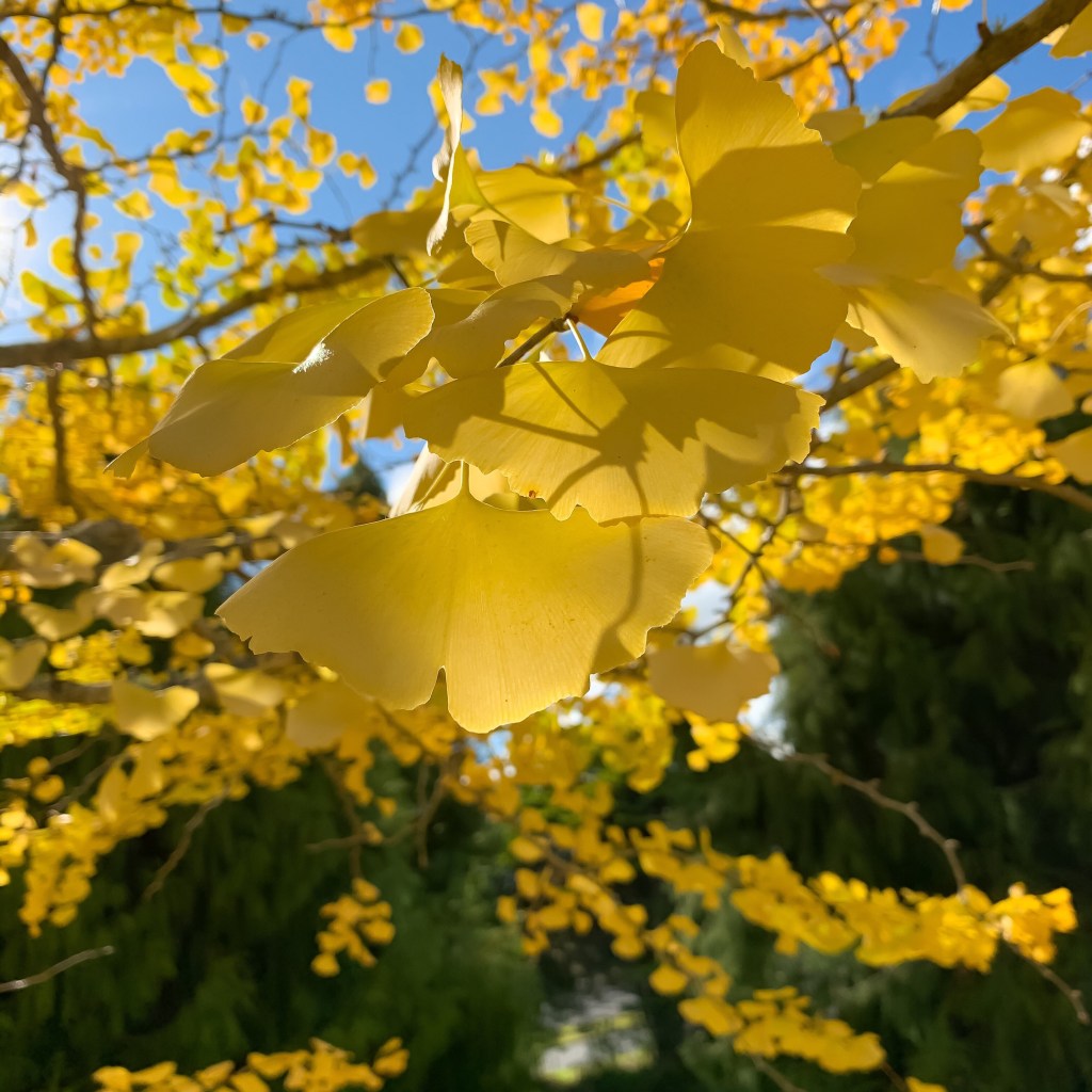 Blowing way some cobwebs in the warm autumn sunshine, a chance to take a breath and just appreciate the beauty of the glorious golden ginkos, some still green and others already completely bare. Autumn always seems so fragile in its beauty and so brief, but all through the chill of winter you have the hope of spring for new growth. Life goes on through all the changes of the seasons.