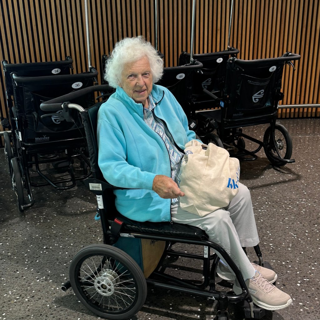 Leaving this morning was another juggling act, mum of course doesn’t remember she is going anywhere, Stu is sleeping in after his very late night, I am trying to figure out if 3 people, luggage and a wheelchair will fit in his tiny car to get us to the airport. I was about to call for an Uber when Fiona texted to say they could take us – huge relief 😅 I had to cut Stu’s hair, wrangle mum to get dressed, clean up the spills on clothes from breakfast, go through the checklist and reassure Ian I have everything, reassure Fiona I have everything under control, convince Fiona I need to take the wheelchair, that air New Zealand know how to ship wheelchairs. I look down at my suitcase minutes before leaving and a little like me it’s is unravelling. Several bent safety pins later