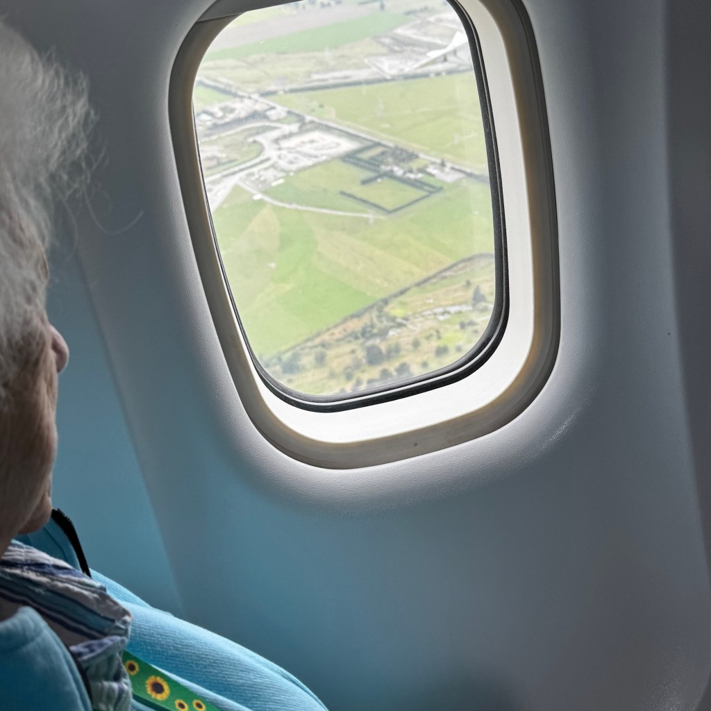 I have to say the moment we got to the airport everything was suddenly very easy, mum was in a wheelchair, folding one was whisked to oversized baggage, we were checked in and all sorted. Taken out to the plane first like VIP’s it was great, lots of attention, mum loved every minute of it, take off circled the city like we were on a tour.